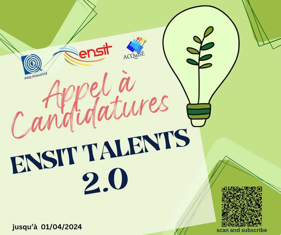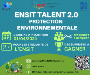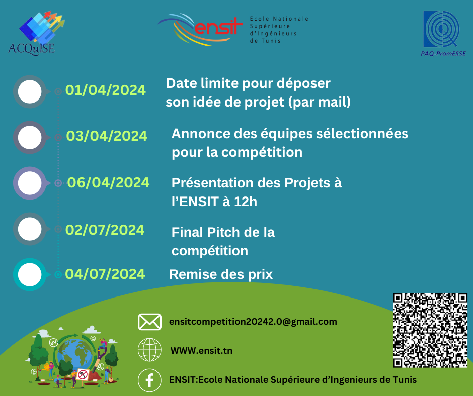 Dans le cadre de son projet PAQ-DGSE, l’ENSIT lance un appel à candidatures pour ses étudiants afin de participer à cette compétition dans sa deuxième version pour l’année 2024. Le thème de cette année est la ‘Protection environnementale’. Pour participer il faut s’inscrire avant le 01/04/2024 en scannant  le QR code dans l’affiche. Des prix de valeurs sont à gagner. pour plus de détails télécharger cc cahier des charges:  Appel à candidature_compétition_V1. L’appel et les étapes pour la sélection :