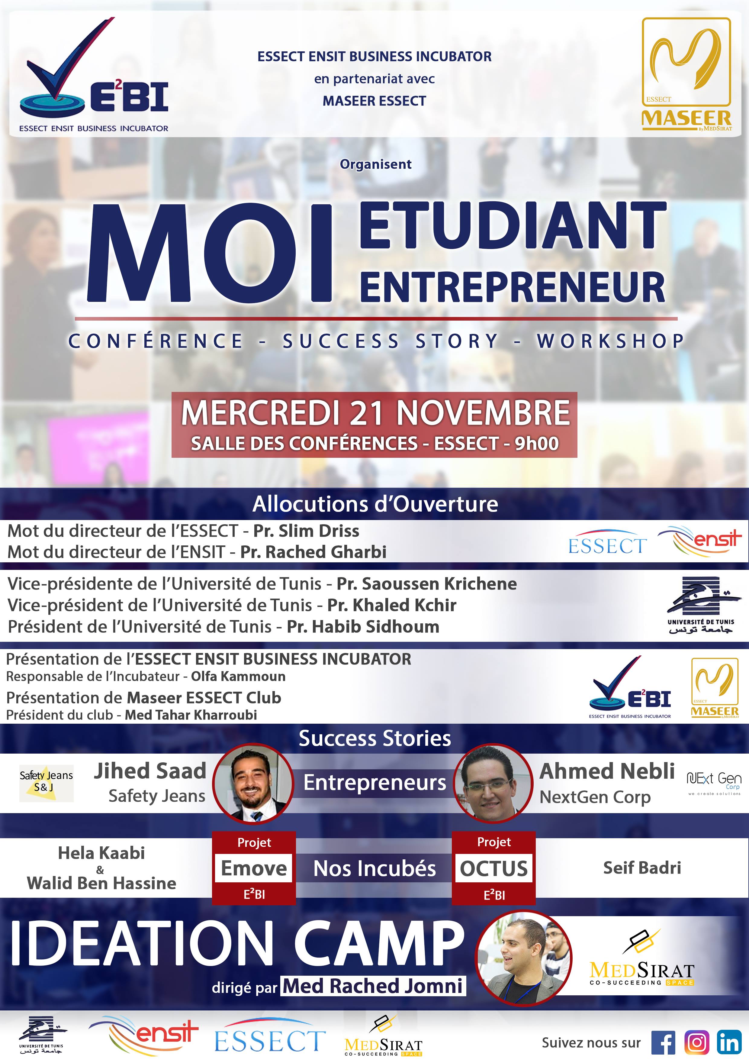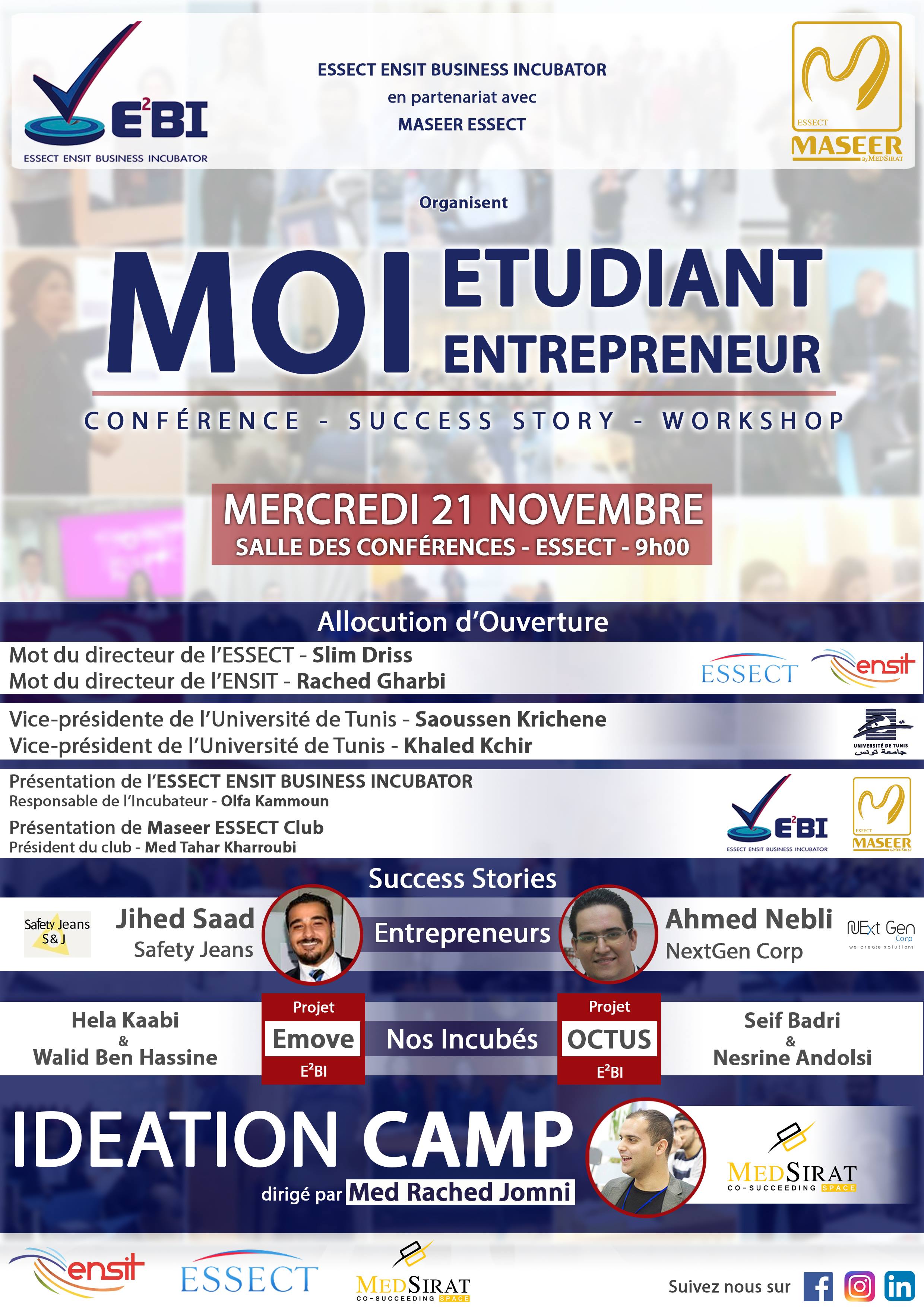 E2BI organise une journée ‘Moi Etudiant Entrepreneur’ le 21 Novembre 2018 à la salle des conférences de l’ESSECT. l’inscription à l’événement est sur ce lien:   https://www.facebook.com/events/918007325066073/