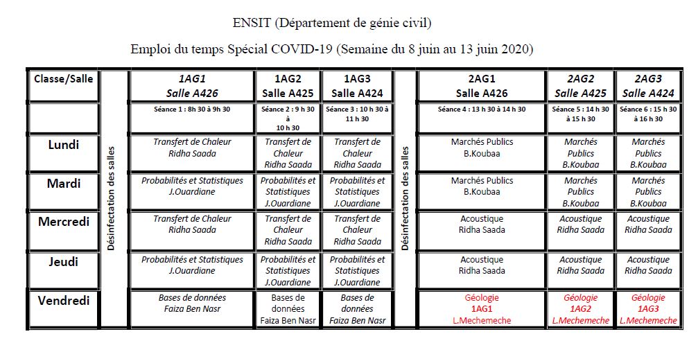 Il est porté à la connaissance des étudiants de l’ENSIT que le retour à l’enseignement présentiel est fixé pour le 08 Juin 2020 après déconfinement selon les emplois du temps suivants: