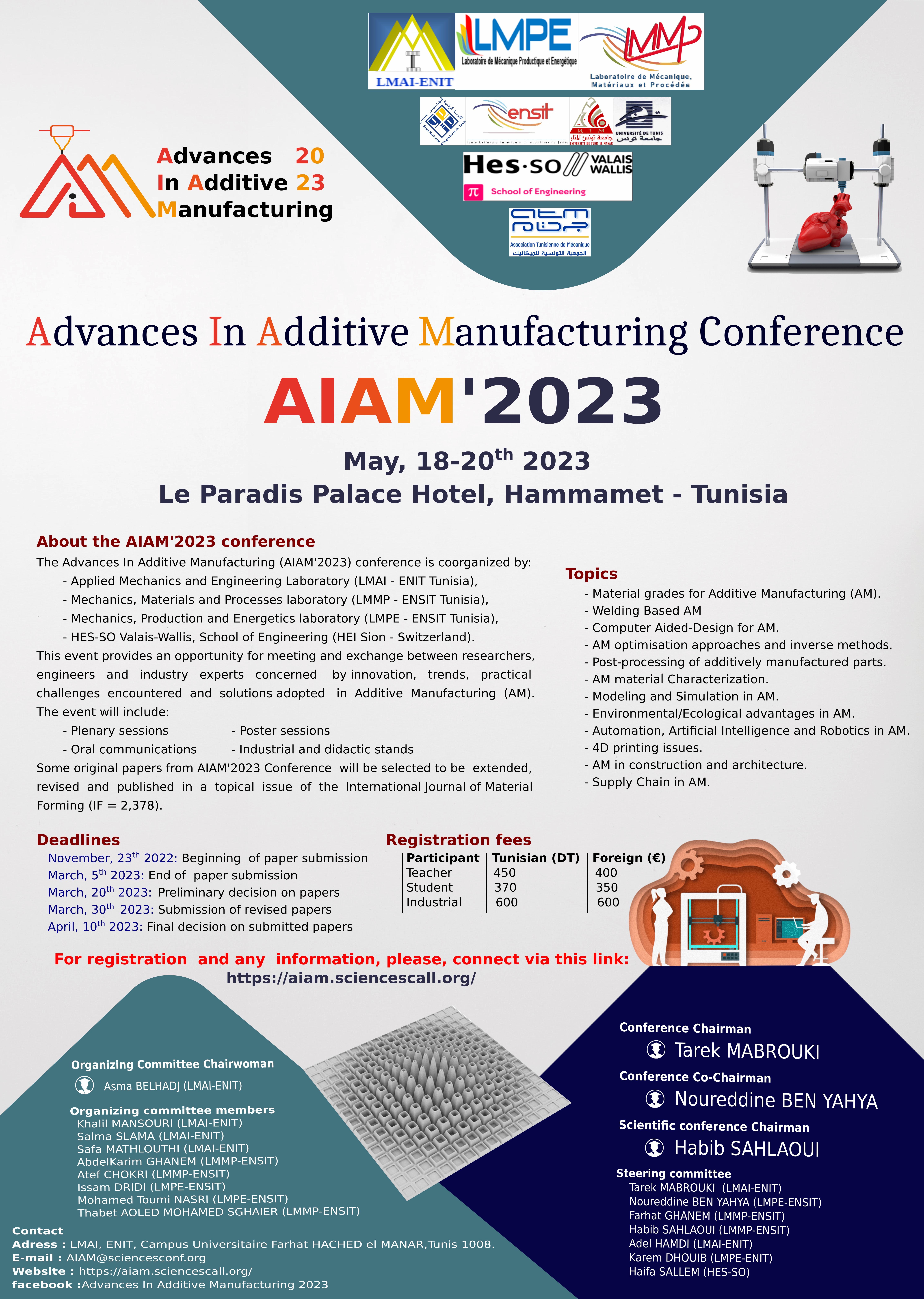 Le laboratoire de recherche LMAI de l’ENIT organise avec leurs partenaires de l’ENSIT (LMPP et LMPE) la conférence AIAM2023: https://aiam.sciencescall.org/resource/page/id/16