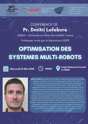 Pr. Dmitri Lefebvre présente une conférence sur le thème: Optimisation des systèmes multi-robots, et ce le Mercredi 10 Mai 2023 à 10h00 à la salle des conférences Mohamed ANNABI.