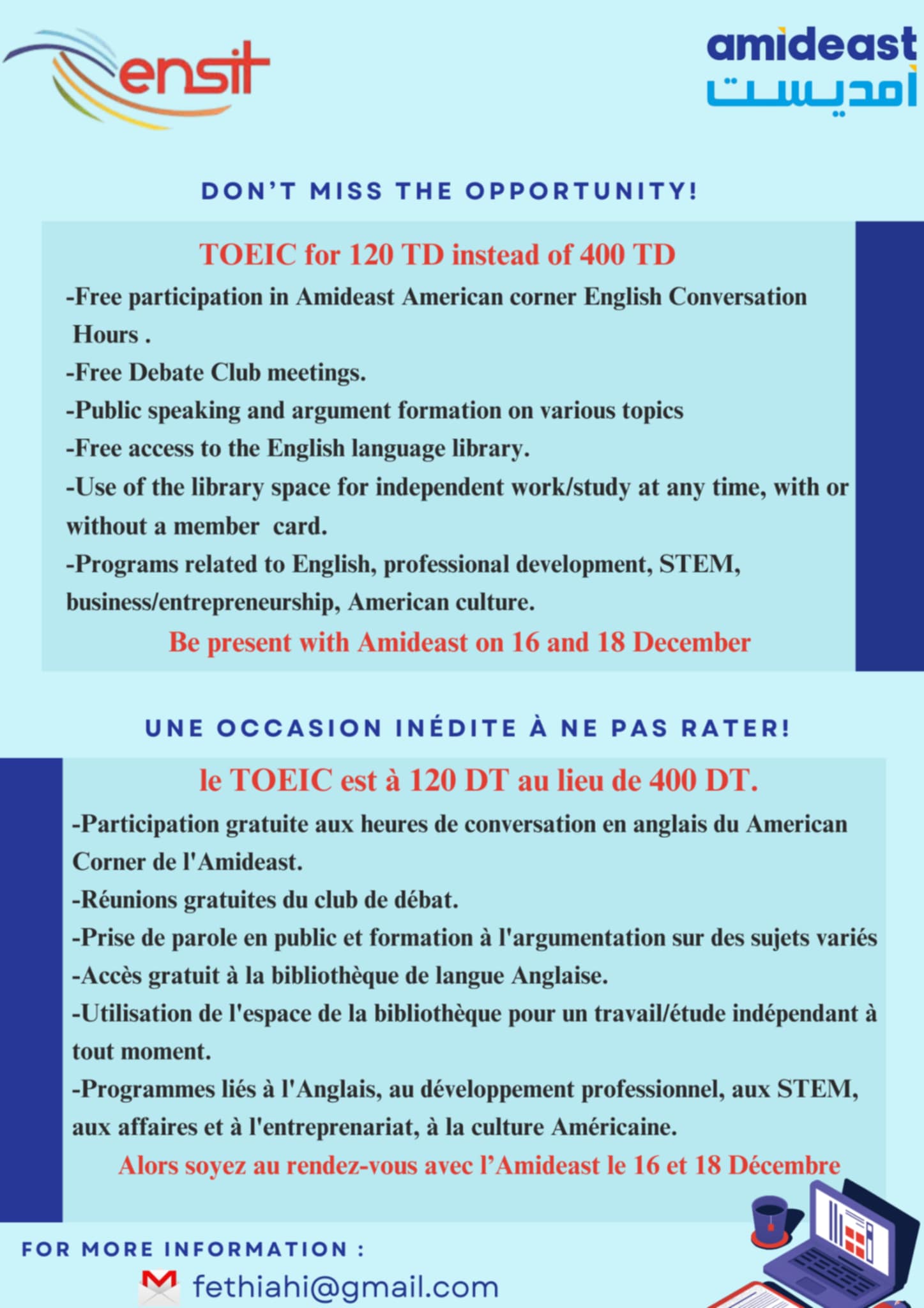 le TOEIC est à 120 DT au lieu de 400 DT.