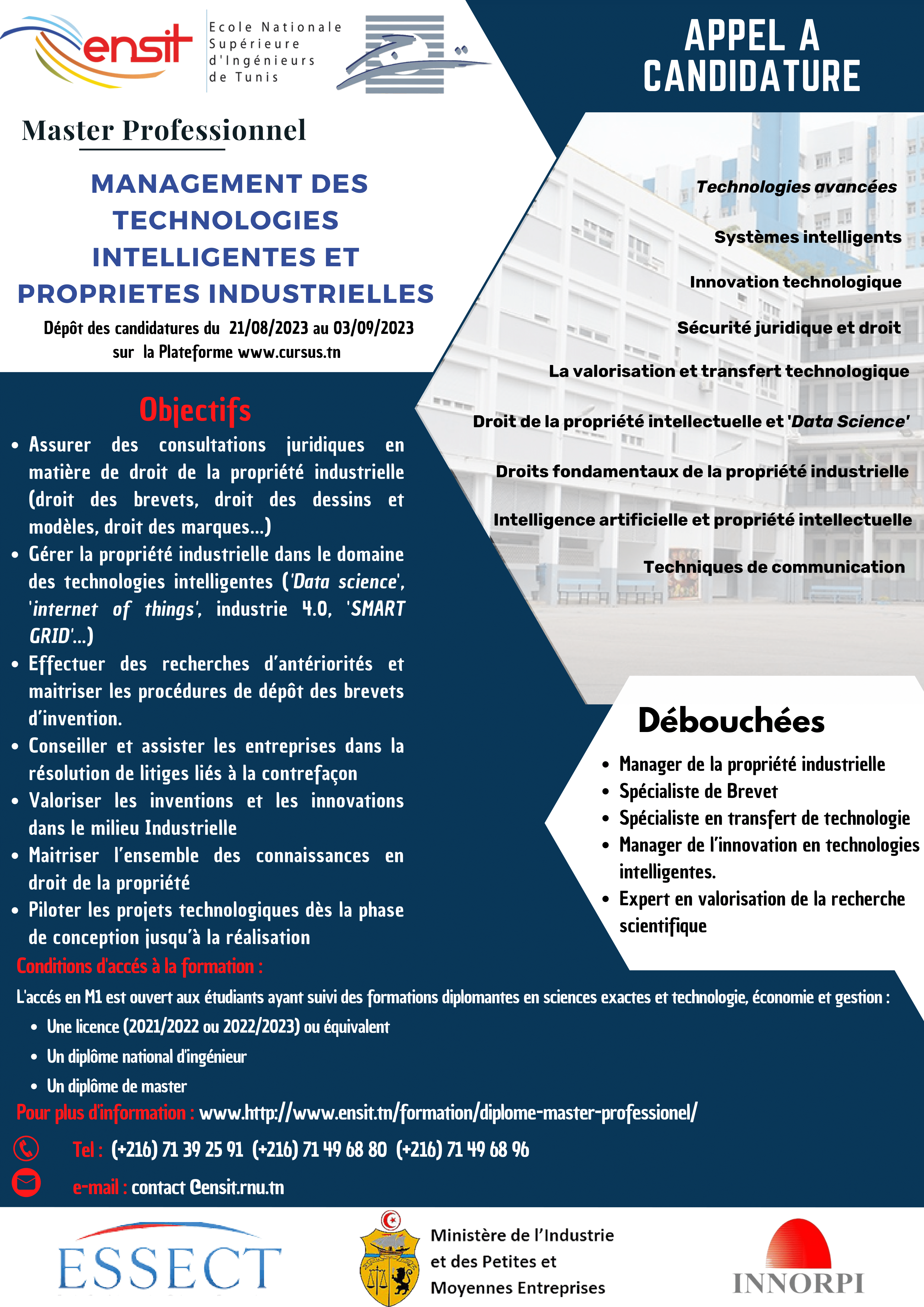 – Management des Technologies Intelligentes et Propriétés Industrielles (MTIPI) en collaboration avec l’ESSECT(Ecole Supérieure des Sciences Economiques et Commerciales de Tunis)
