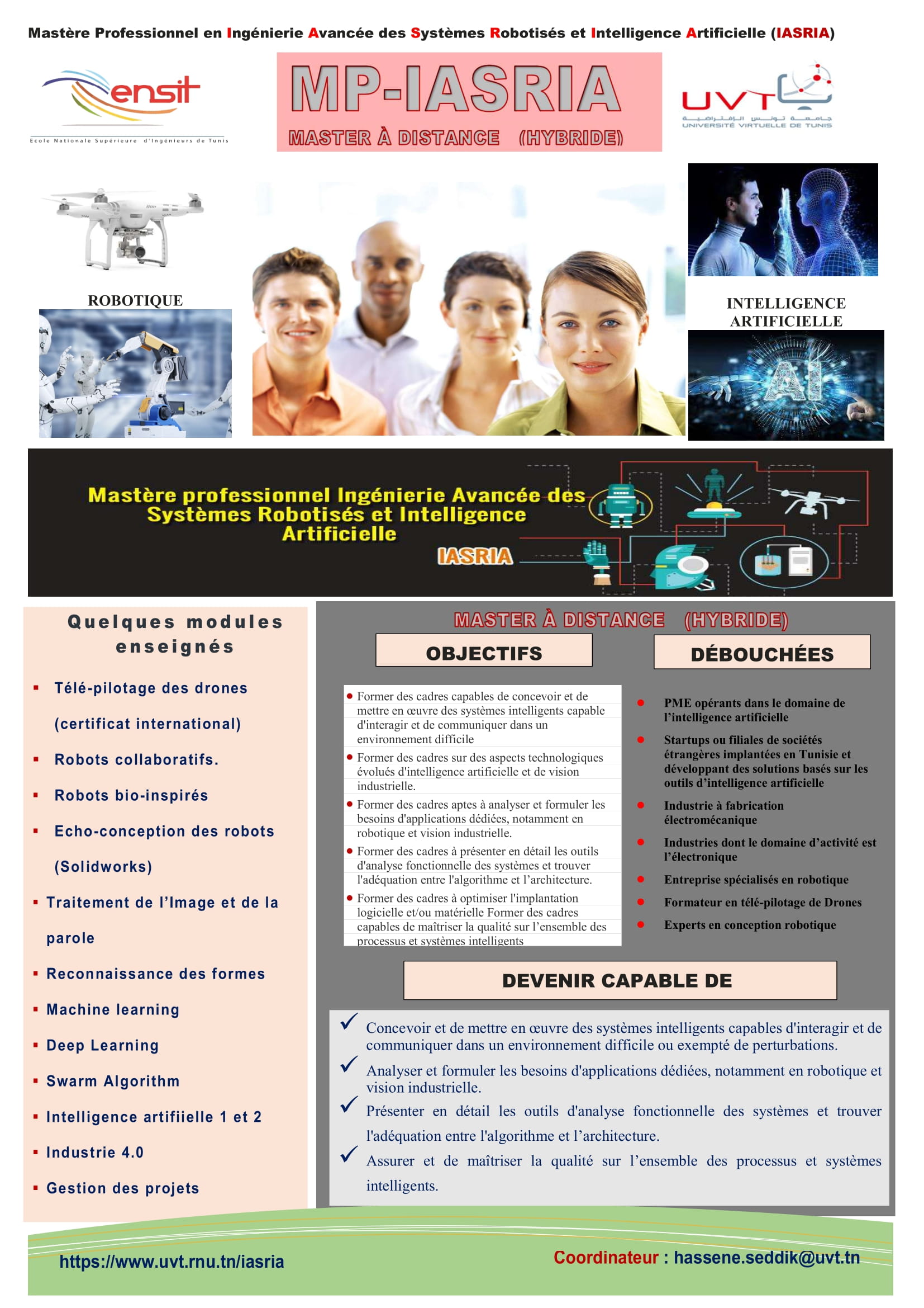 Master Professionnel en co-diplomation entre l’Ecole Nationale Supérieure d’Ingénieurs de Tunis (ENSIT) et l’Université Virtuelle de Tunis (UVT)Master Professionnel en Ingénierie Avancée des Systèmes Robotisés et Intelligence Artificielle (IASRIA)